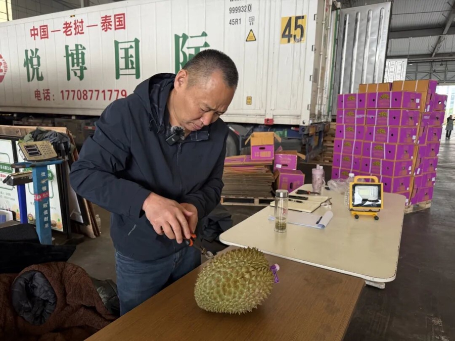 挑果、称重、装车,果香浓郁的金枕头榴莲陆续抵达西郊国际农产品交易中心,成为当下水果市场的热门爆款。依托中老铁路“澜湄快线”与跨境冷链联运搭建的运输通道,东南亚产地采摘的榴莲,仅需3至4天就能从果园直达上海批发市场,相较传统海运方式提速一周左右,最大程度保留果实本味,为上海鲜果供应筑牢源头基础。