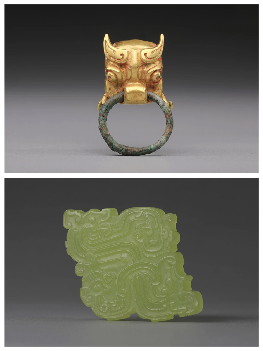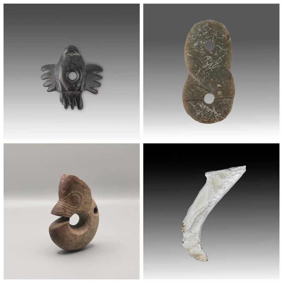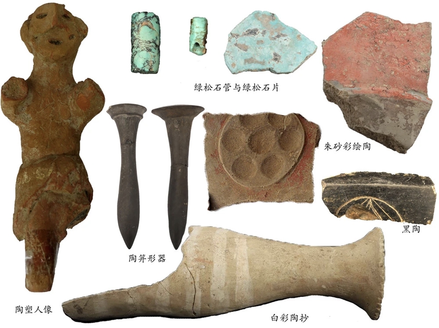 郑家沟1号积石冢玉鸮、双联璧、玉龙、蚌饰(从左到右,从上到下)。