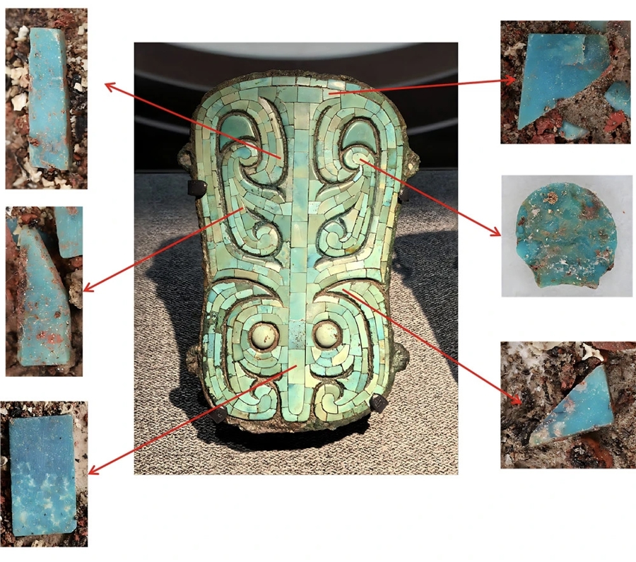 钟村M10绿松石嵌片与二里头遗址出土绿松石牌饰对比。