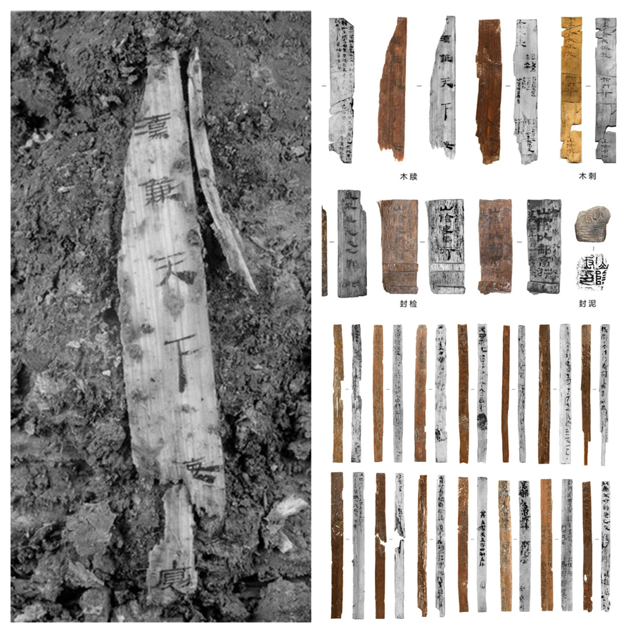 稽中地点出土汉代《仓颉篇》“汉兼天下”简牍(左),汉代木牍、木刺、封检、封泥(右上),三国时期竹简(右下)。