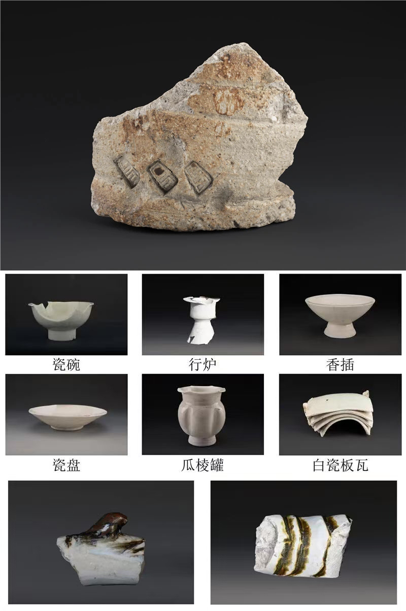 上图:官字款匣钵;中图:瓷碗、行炉、香插、瓷盘、瓜棱罐、白瓷板瓦;下图:鸱吻残块。